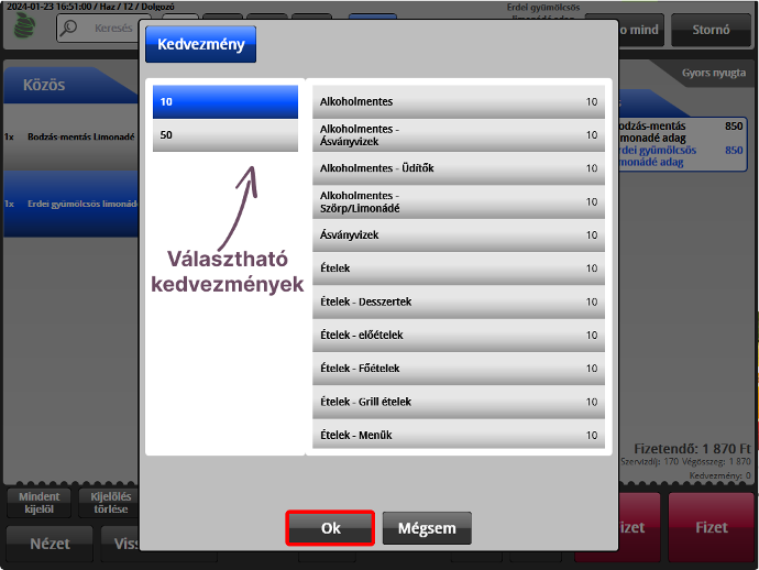 Bal oldalt egy listában láthatod az összes kedvezményt. Jelöld ki az alkalmazni kívánt kedvezményt, majd alkalmazd a termékeken az  segítségével!